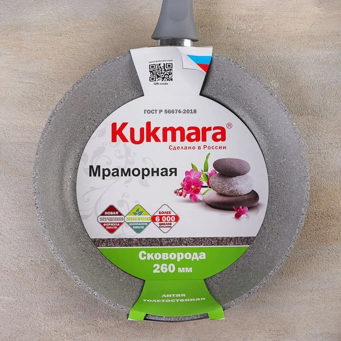 Посуда Kukmara «Мраморная» изготовлена из литого алюминия и покрыта инновационным антипригарным мраморным покрытием на водной основе, усиленным сверхтвёрдыми частицами минералов.