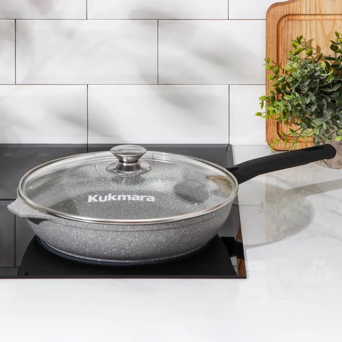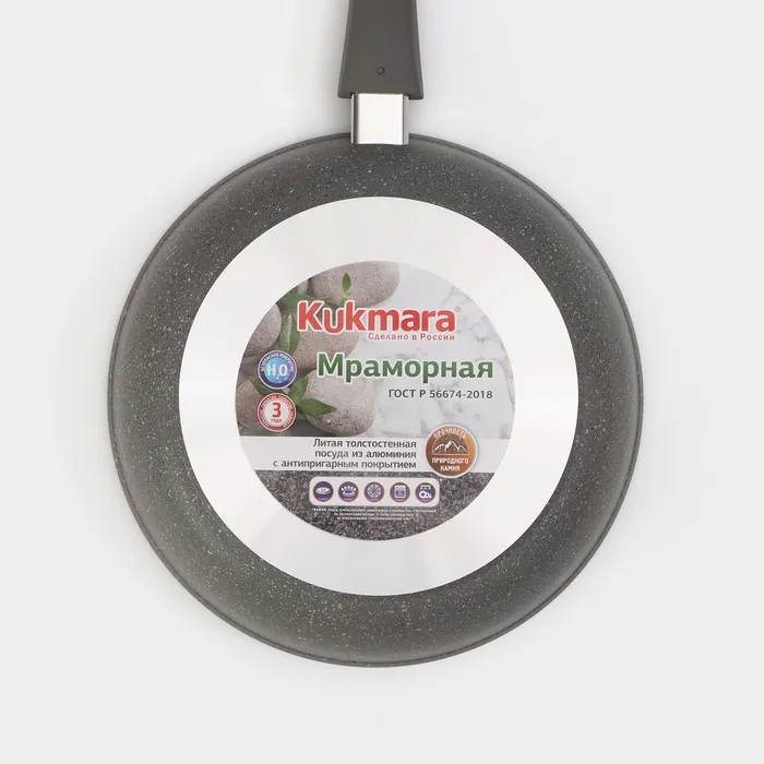 Посуда Kukmara «Мраморная» изготовлена из литого алюминия и покрыта инновационным антипригарным мраморным покрытием на водной основе, усиленным сверхтвёрдыми частицами минералов.