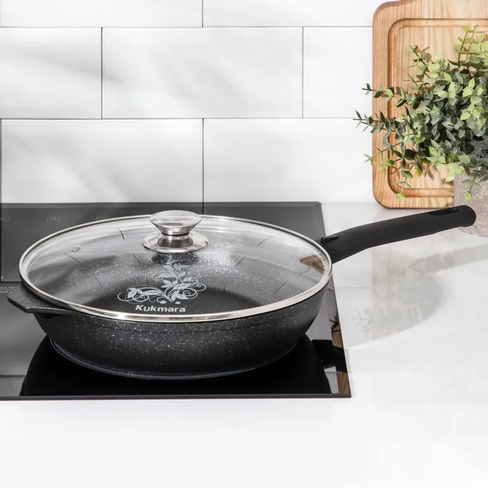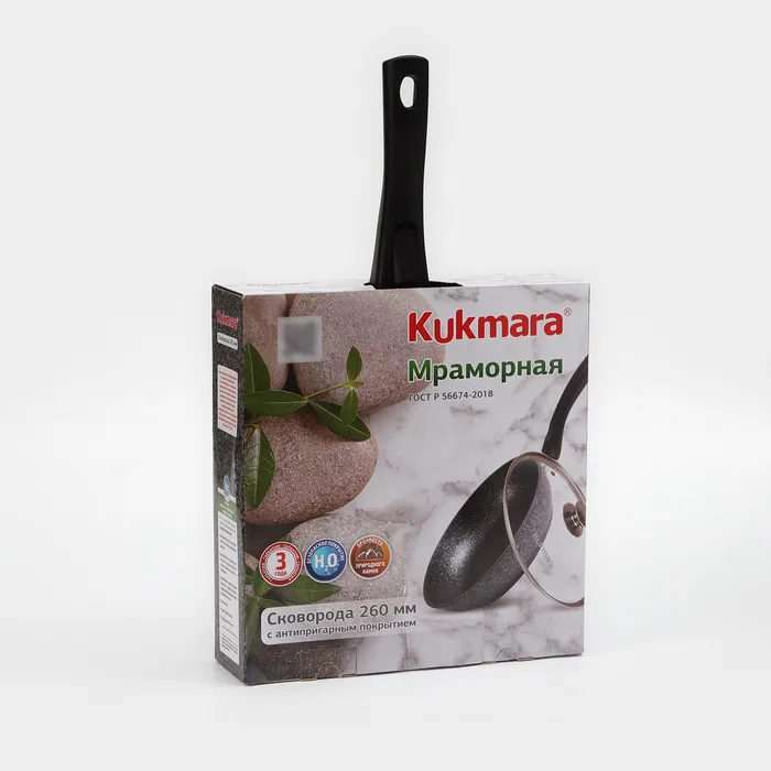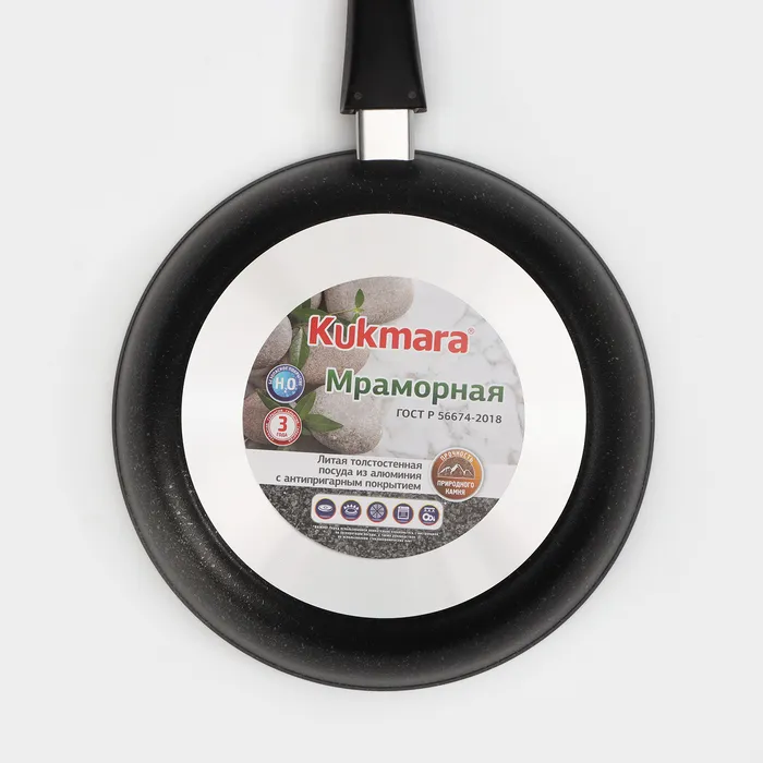 Посуда Kukmara «Мраморная» изготовлена из литого алюминия и покрыта инновационным антипригарным мраморным покрытием на водной основе, усиленным сверхтвёрдыми частицами минералов.