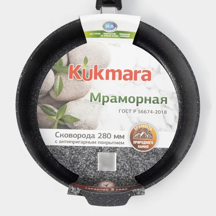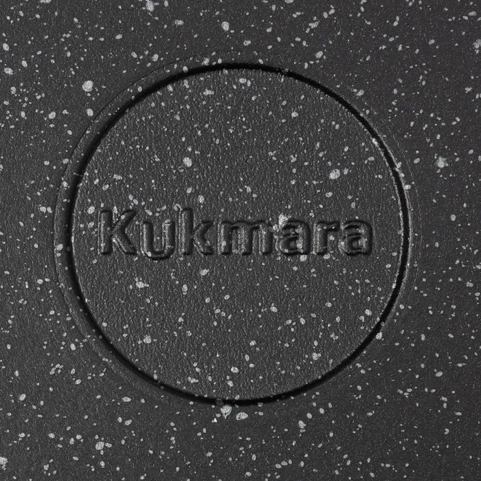 Посуда Kukmara «Мраморная» изготовлена из литого алюминия и покрыта инновационным антипригарным мраморным покрытием на водной основе, усиленным сверхтвёрдыми частицами минералов.