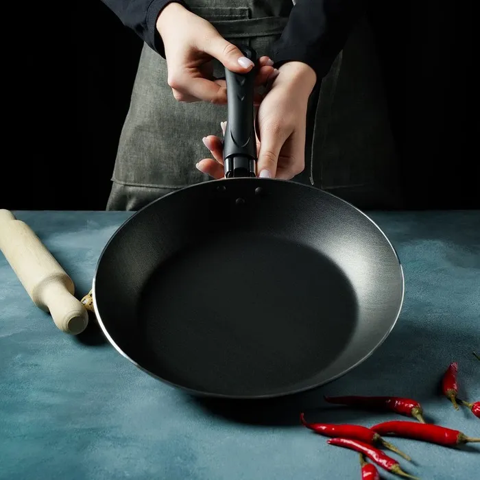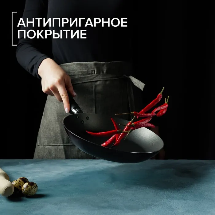 Сковорода изготовлена из высококачественного материала, обеспечивающего равномерное распределение тепла по всей поверхности. Антипригарное покрытие предотвращает прилипание продуктов и облегчает процесс мытья. Удобная пластиковая ручка не нагревается во время готовки, что обеспечивает безопасность использования.