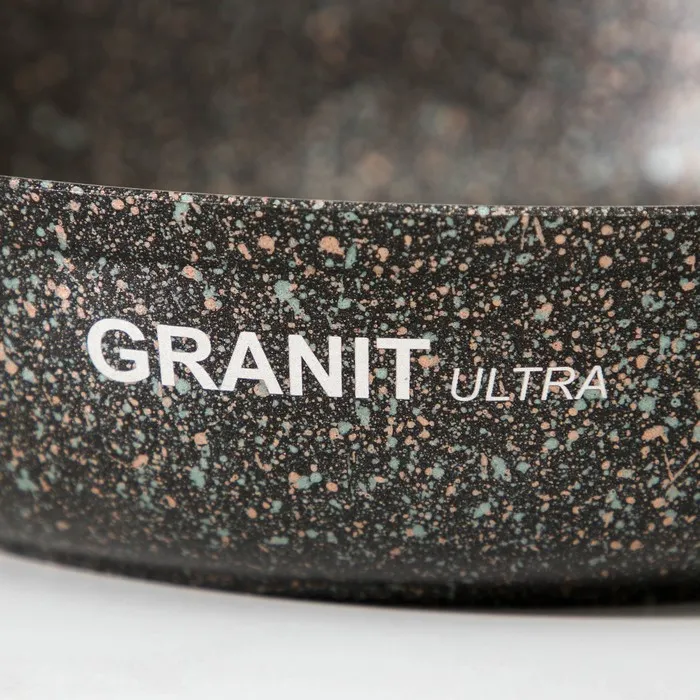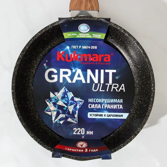 Сковорода Kukmara изготовлена из литого алюминия и покрыта ультрапрочным антипригарным покрытием Ultra granit. Оно усилено сверхтвёрдыми минералами, близкими по твёрдости алмазу, и продлевает срок службы посуды более чем в 7 раз. Покрытие позволяет использовать при готовке даже металлические кухонные принадлежности.