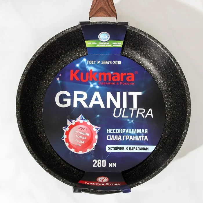 Сковорода Kukmara изготовлена из литого алюминия и покрыта ультрапрочным антипригарным покрытием Ultra granit. Оно усилено сверхтвёрдыми минералами, близкими по твёрдости алмазу, и продлевает срок службы посуды более чем в 7 раз. Покрытие позволяет использовать при готовке даже металлические кухонные принадлежности.