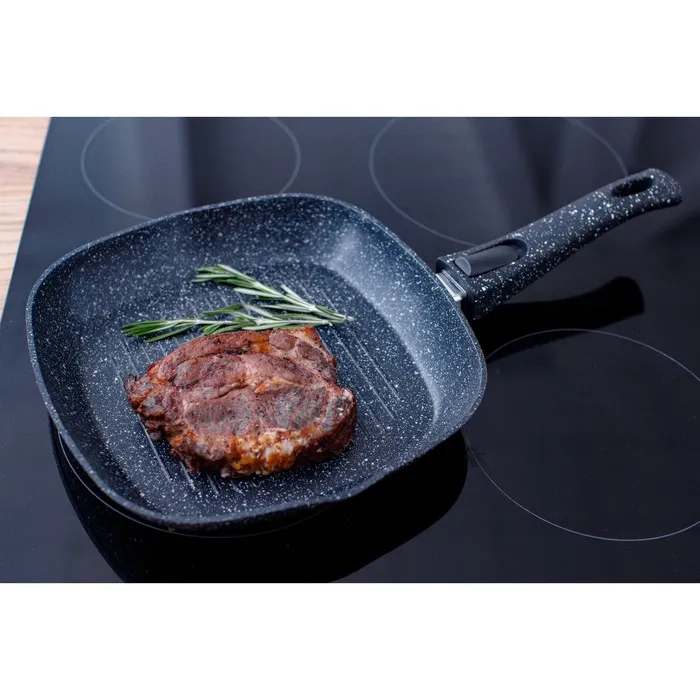 Сковорода-гриль Magistro серии Dark изготовлена из кованого алюминия, имеет прочное антипригарное покрытие с вкраплениями мраморных частиц. В такой посуде удобно жарить, тушить, она прекрасно сохраняет сочность мяса, рыбы, птицы и овощей.