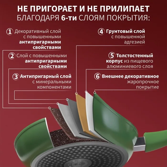 - Высококачественый кованый алюминий с толстым дном 3 мм сохранит форму изделия даже если сковородка была перегрета.