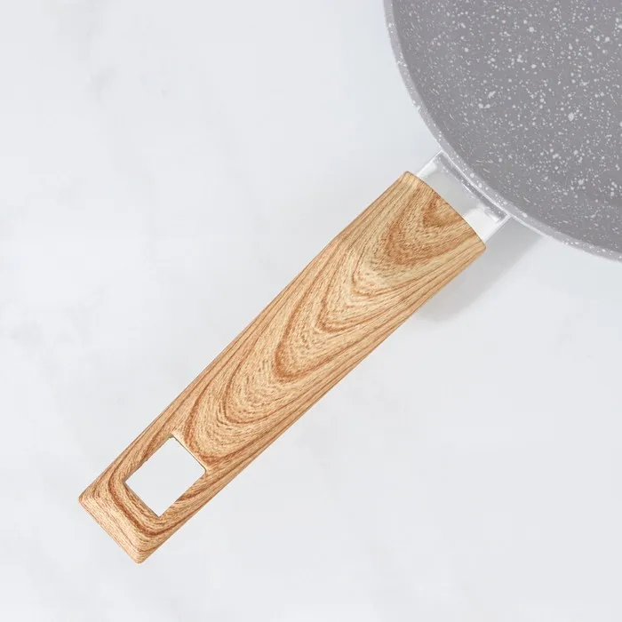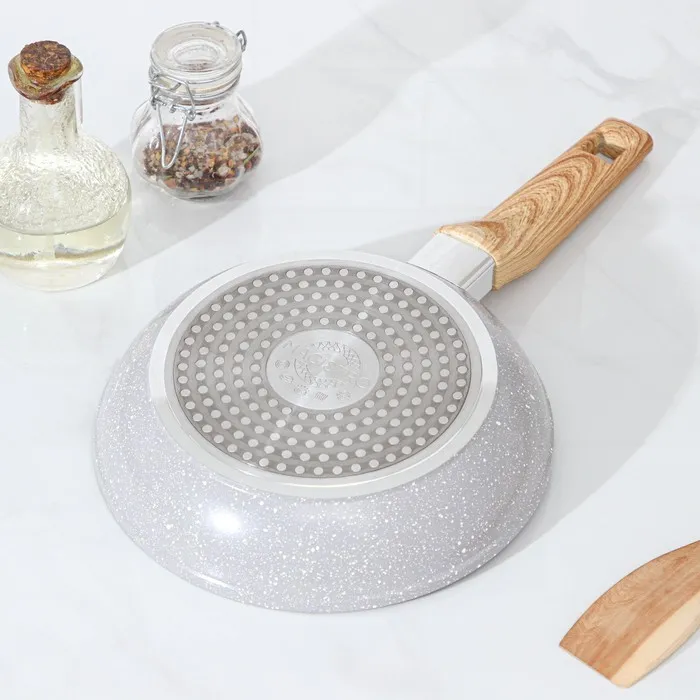 - Многослойное антипригарное покрытие с эффектом мрамора снижает расход масла и уменьшает калорийность блюд.