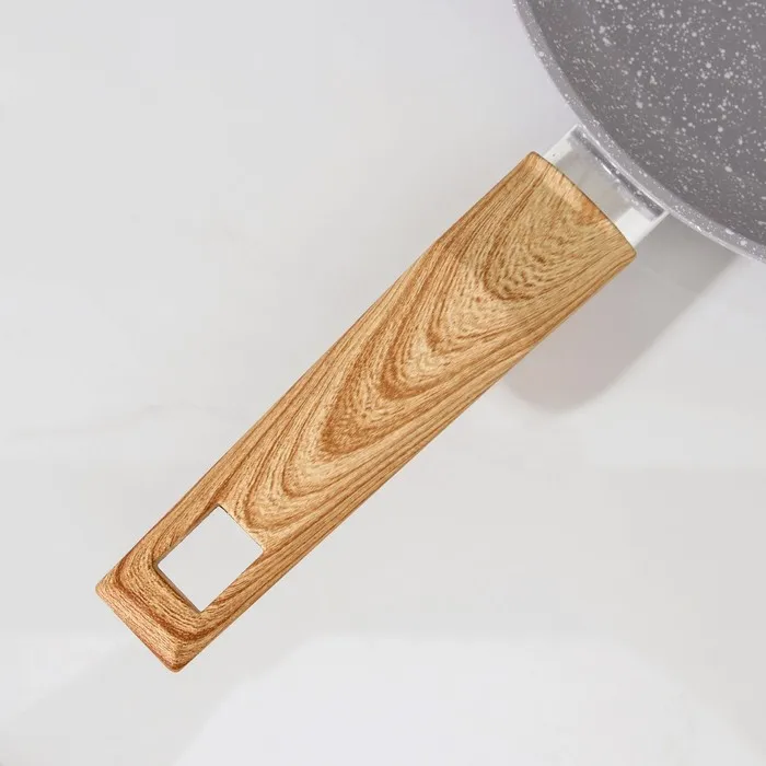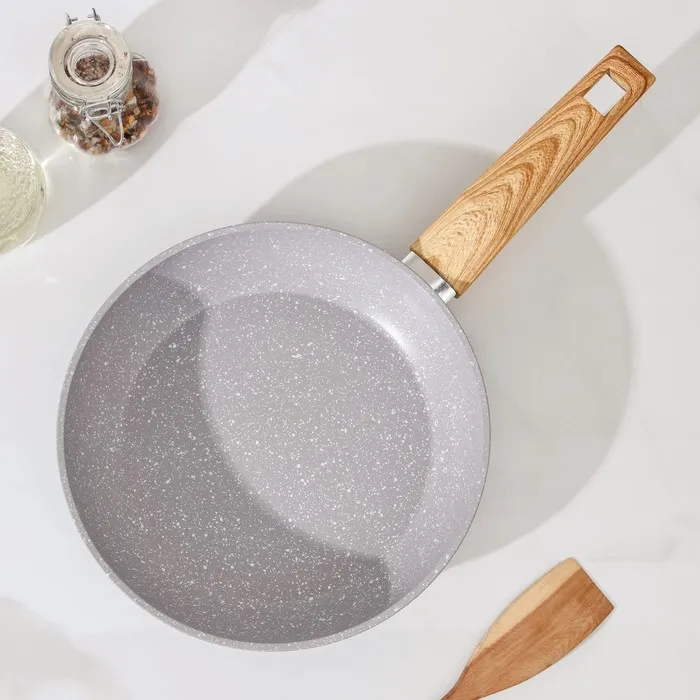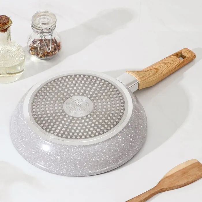 - Многослойное антипригарное покрытие с эффектом мрамора снижает расход масла и уменьшает калорийность блюд.