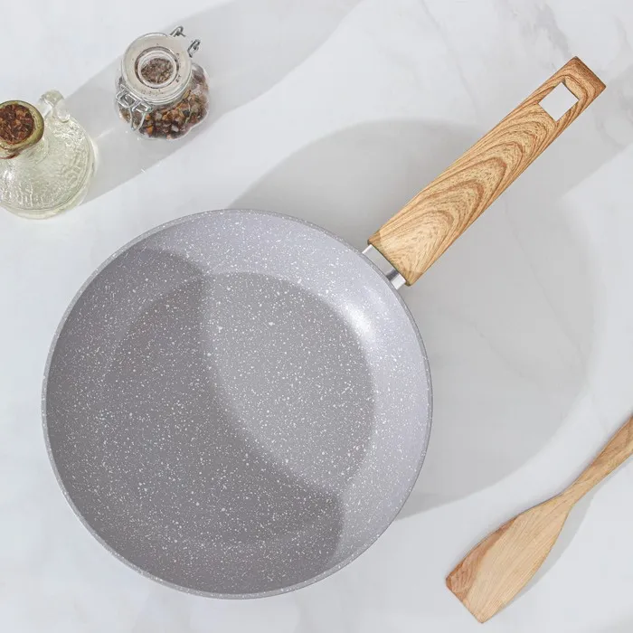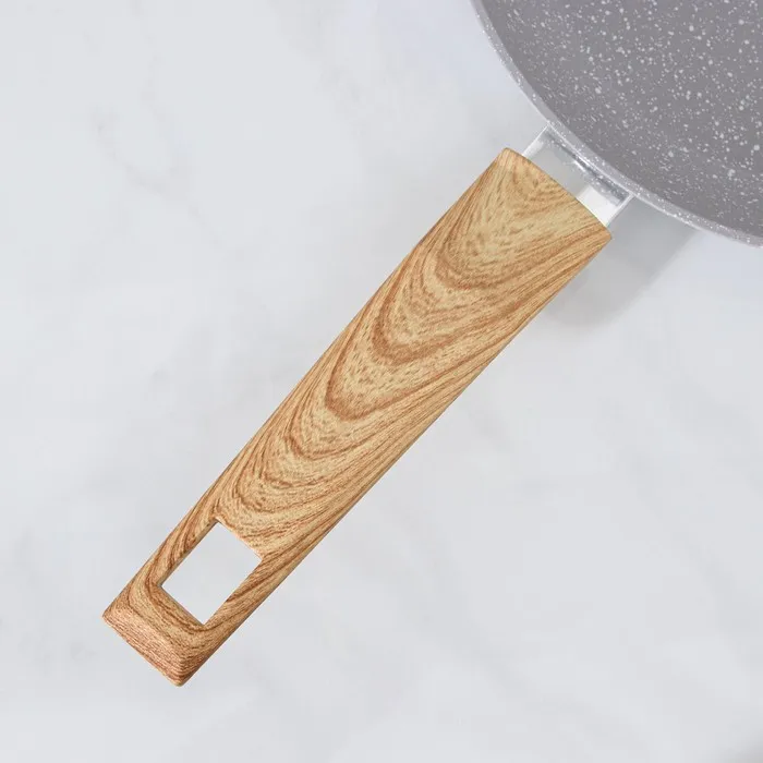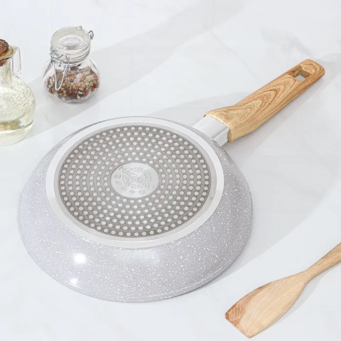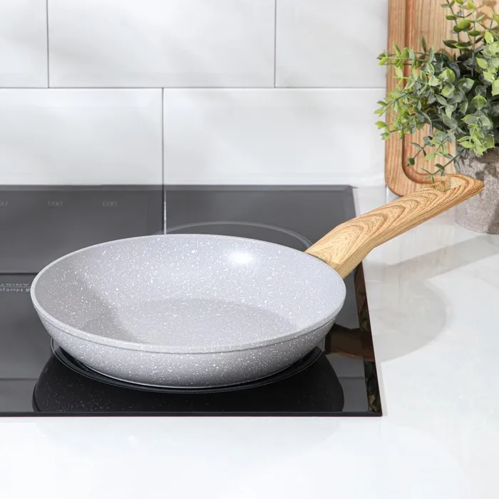 - Многослойное антипригарное покрытие с эффектом мрамора снижает расход масла и уменьшает калорийность блюд.