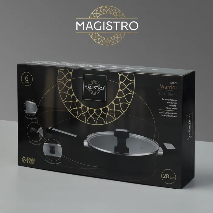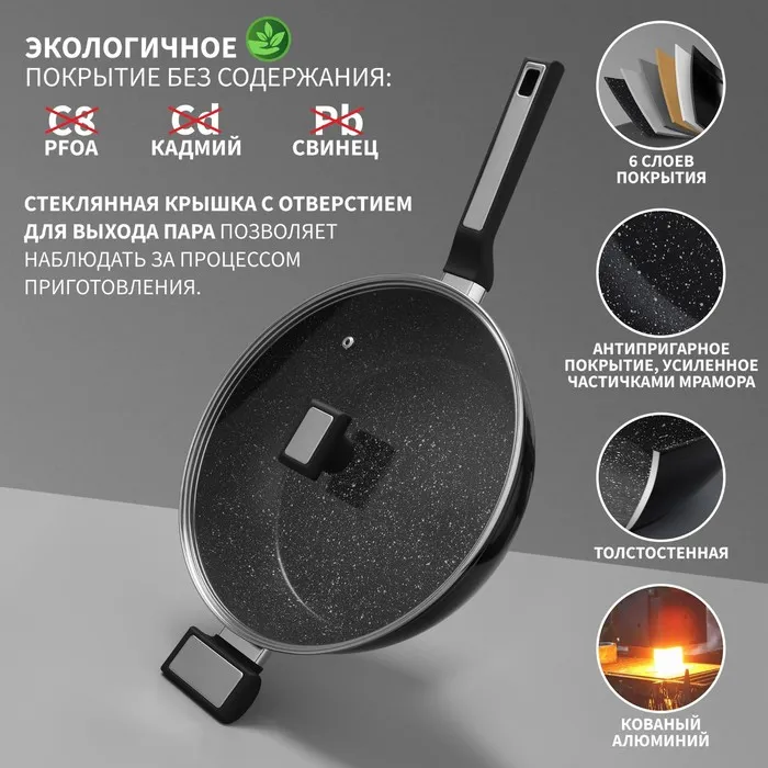 Сковорода Magistro Warrior, d=28 см, h=7.5 см, кованый алюминий, со стеклянной крышкой, ручка soft-touch, антипригарное покрытие, индукция, чёрная — Характеристики