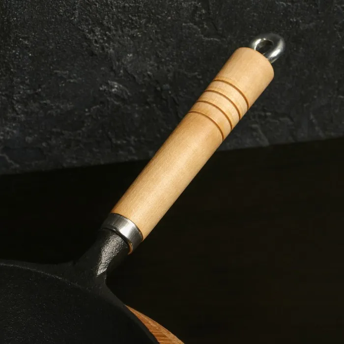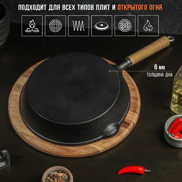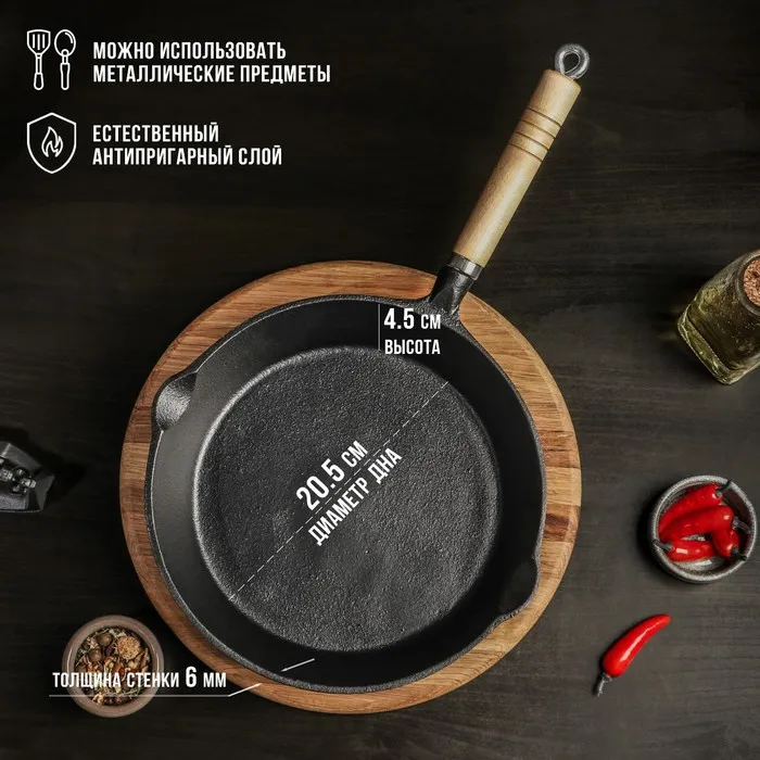 Сковорода Magma «Эко», 25×4.5 см, чугун, с 2 сливами, съёмная деревянная ручка, индукция, чёрная — Характеристики