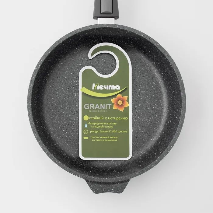 Сковорода из литого толстостенного алюминия «Мечта» станет незаменимым инструментом и надежным помощником на вашей кухне. Многофункциональная сковорода Гранит отлично подойдет для приготовления разнообразных блюд из мяса, рыбы и овощей. Благодаря термоаккумулирующим свойствам пищевого алюминия, пища на сковороде Гранит не пригорает, а томится, а благодаря новейшей формуле сверхпрочного антипригарного покрытия готовить можно при минимальном количестве масла не переживая за то что пища может пригореть. На посуде ТМ «Мечта» можно жарить, тушить и варить без потерь вкусовых и полезных качеств продуктов. Сковорода гранит из литого высококачественного пищевого алюминия «Мечта» станет незаменимым инструментом и надежным помощником на вашей кухне.