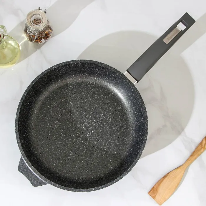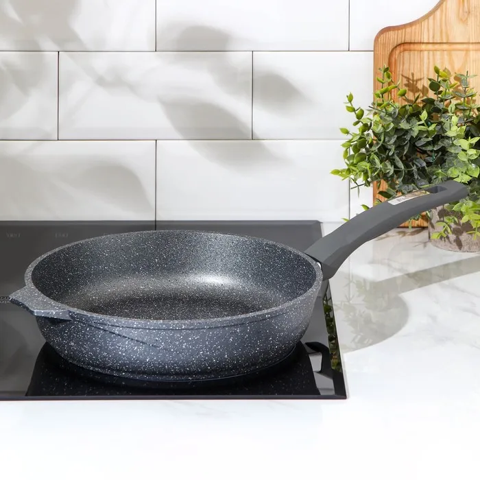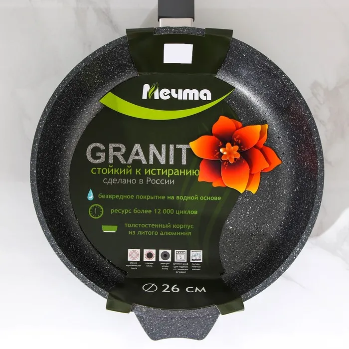 Сковорода из литого толстостенного алюминия «Мечта» станет незаменимым инструментом и надежным помощником на вашей кухне. Многофункциональная сковорода Гранит отлично подойдет для приготовления разнообразных блюд из мяса, рыбы и овощей. Благодаря термоаккумулирующим свойствам пищевого алюминия, пища на сковороде Гранит не пригорает, а томится, а благодаря новейшей формуле сверхпрочного антипригарного покрытия готовить можно при минимальном количестве масла не переживая за то что пища может пригореть. На посуде ТМ «Мечта» можно жарить, тушить и варить без потерь вкусовых и полезных качеств продуктов. Сковорода гранит из литого высококачественного пищевого алюминия «Мечта» станет незаменимым инструментом и надежным помощником на вашей кухне.