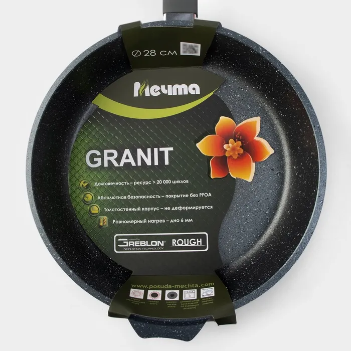 Сковорода из литого толстостенного алюминия «Мечта» станет незаменимым инструментом и надежным помощником на вашей кухне. Многофункциональная сковорода Гранит отлично подойдет для приготовления разнообразных блюд из мяса, рыбы и овощей. Благодаря термоаккумулирующим свойствам пищевого алюминия, пища на сковороде Гранит не пригорает, а томится, а благодаря новейшей формуле сверхпрочного антипригарного покрытия готовить можно при минимальном количестве масла не переживая за то что пища может пригореть. На посуде ТМ «Мечта» можно жарить, тушить и варить без потерь вкусовых и полезных качеств продуктов. Сковорода гранит из литого высококачественного пищевого алюминия «Мечта» станет незаменимым инструментом и надежным помощником на вашей кухне.
