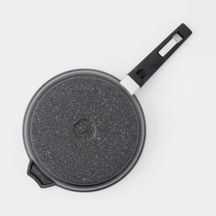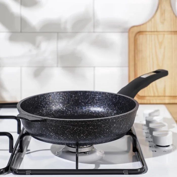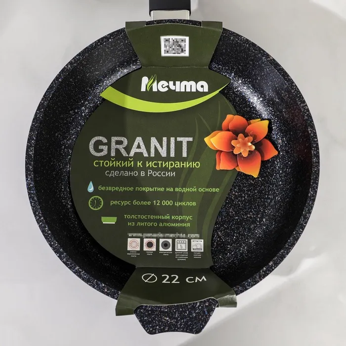 Сковорода из литого толстостенного алюминия «Мечта» станет незаменимым инструментом и надежным помощником на вашей кухне. Многофункциональная сковорода Гранит отлично подойдет для приготовления разнообразных блюд из мяса, рыбы и овощей. Благодаря термоаккумулирующим свойствам пищевого алюминия, пища на сковороде Гранит не пригорает, а томится, а благодаря новейшей формуле сверхпрочного антипригарного покрытия готовить можно при минимальном количестве масла не переживая за то что пища может пригореть. На посуде ТМ «Мечта» можно жарить, тушить и варить без потерь вкусовых и полезных качеств продуктов. Сковорода гранит из литого высококачественного пищевого алюминия «Мечта» станет незаменимым инструментом и надежным помощником на вашей кухне.
