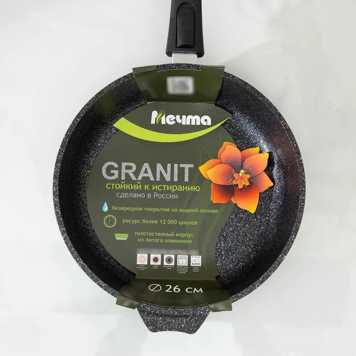 Сковорода из литого толстостенного алюминия «Мечта» станет незаменимым инструментом и надежным помощником на вашей кухне. Многофункциональная сковорода Гранит отлично подойдет для приготовления разнообразных блюд из мяса, рыбы и овощей. Благодаря термоаккумулирующим свойствам пищевого алюминия, пища на сковороде Гранит не пригорает, а томится, а благодаря новейшей формуле сверхпрочного антипригарного покрытия готовить можно при минимальном количестве масла не переживая за то что пища может пригореть. На посуде ТМ «Мечта» можно жарить, тушить и варить без потерь вкусовых и полезных качеств продуктов. Сковорода гранит из литого высококачественного пищевого алюминия «Мечта» станет незаменимым инструментом и надежным помощником на вашей кухне.