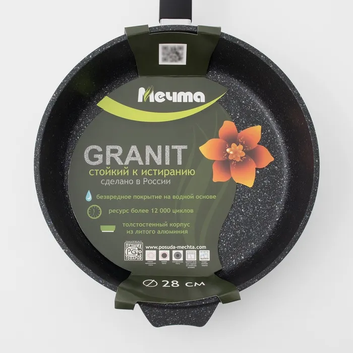 Сковорода из литого толстостенного алюминия «Мечта» станет незаменимым инструментом и надежным помощником на вашей кухне. Многофункциональная сковорода Гранит отлично подойдет для приготовления разнообразных блюд из мяса, рыбы и овощей. Благодаря термоаккумулирующим свойствам пищевого алюминия, пища на сковороде Гранит не пригорает, а томится, а благодаря новейшей формуле сверхпрочного антипригарного покрытия готовить можно при минимальном количестве масла не переживая за то что пища может пригореть. На посуде ТМ «Мечта» можно жарить, тушить и варить без потерь вкусовых и полезных качеств продуктов. Сковорода гранит из литого высококачественного пищевого алюминия «Мечта» станет незаменимым инструментом и надежным помощником на вашей кухне.