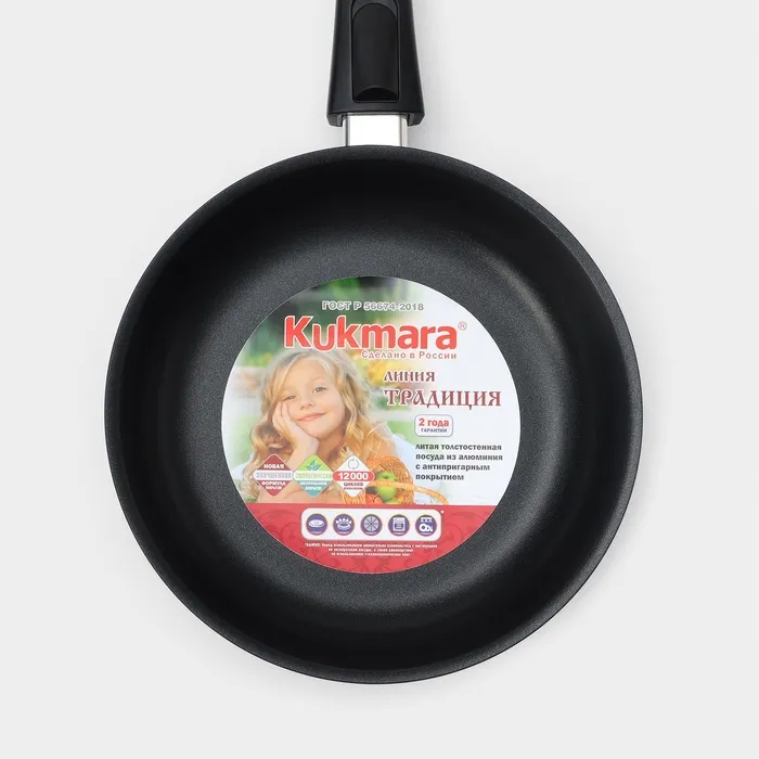 Продукция Kukmara изготовлена из литого алюминия и покрыта немецким высококачественным антипригарным покрытием на водной основе, усиленным сверхпрочными минеральными частицами.