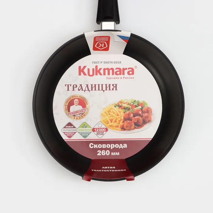 Продукция Kukmara изготовлена из литого алюминия и покрыта немецким высококачественным антипригарным покрытием на водной основе, усиленным сверхпрочными минеральными частицами.