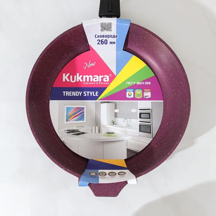 Посуда линии Trendy style разработана в соответствии с последними модными тенденциями. Сковорода Kukmara сделана из литого алюминия, с внутренней и внешней стороны — антипригарное покрытие увеличенной прочности, изготовлено на водной основе по немецким технологиям.