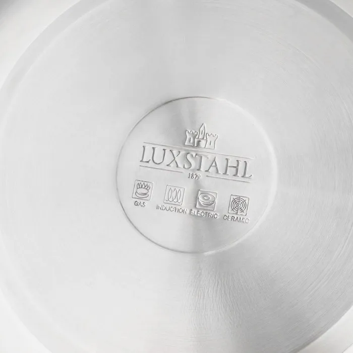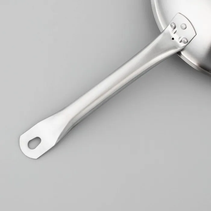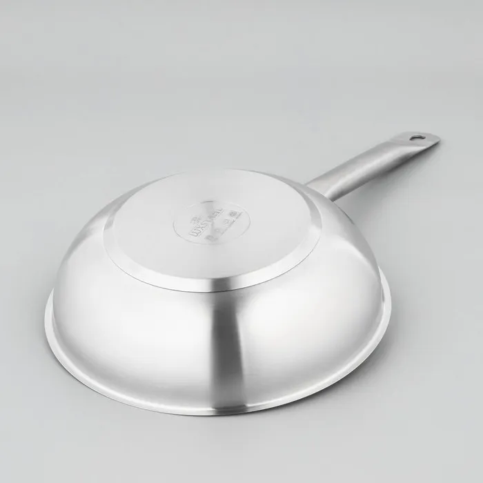 Сковорода из нержавеющей стали — необходимый атрибут любой профессиональной кухни. Достоинства изделия: Благодаря низкой теплопроводности металла приготовленное блюдо долго остаётся горячим. Полировка придаёт посуде эффектный вид. Конструкция дна обеспечивает быстрый и равномерный прогрев пищи. Толщина дна 5 мм. Подходит ко всем видам плит, в том числе индукционных. Можно мыть в посудомоечной машине. Рекомендации по уходу за посудой • Удалите с посуды все этикетки и наклейки. • Перед первым использованием тщательно промойте посуду горячей водой с мягким моющим средством, хорошо сполосните ее и вытрите насухо, во избежание образования пятен и разводов от воды на полированной поверхности. • Запрещено использовать жесткие предметы для чистки посуды, включая, не ограничиваясь: жесткие щетки, металлические мочалки, абразивные средства, пористые каменные материалы и прочее. Использование жестких предметов для чистки приводит к быстрому разрушению защитного слоя и поверхности посуды. • После мыться следует насухо вытереть всю поверхность посуды для придания ей большего блеска. • После мытья в посудомоечной машине посуду следует без промедления вынуть, во избежание образования пятен под воздействием кондиционной влаги. В крайнем случае, следует открыть крышку машины сразу после завершения процесса мытья. • При мытье посуды из нержавеющей стали со временем может измениться цвет пластиковых и бакелитовых аксессуаров, однако это никоим образом не влияет на их функциональность. • Не рекомендуем применять для мытья посуды, сильно хлорированные или содержащие кислоту моющие средства. • Для мытья стеклянных крышек не применяйте моющие средства, содержащие абразивные добавки, т.к. появление царапин на стекле резко снижает его стойкость к термоударам. • Не используйте холодную воду для охлаждения. Резкие перепады температур могут стать причиной изменения цвета металла, а также деформации поверхности. • При правильном обращении посуды и уходу за ней, пища не пригорает (при соблюдении режима приготовления блюда). Если вследствие некорректной эксплуатации это произошло, то не следует более применять металлические и другие жесткие щетки, абразивные вещества и хлорсодержащие средства, а лучше наполнить кастрюлю водой с моющим средством, довести до кипения, а затем остудить. • Поверхность посуды из нержавеющей стали может покрываться радужными пятнами (преимущественно синего и желтого оттенков), особенно наглядно это явление после первого использования. Эти пятна легко удаляются 4,5% раствором столового уксуса или лимонной кислоты. • Во избежание ухудшения внешнего вида посуды не рекомендуется надолго оставлять ее в грязном виде. Мойте посуду сразу после приготовления пищи.