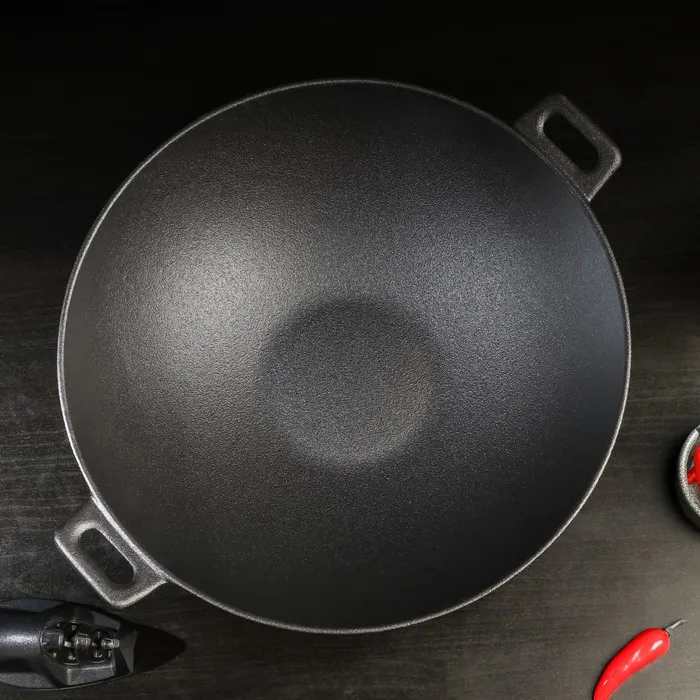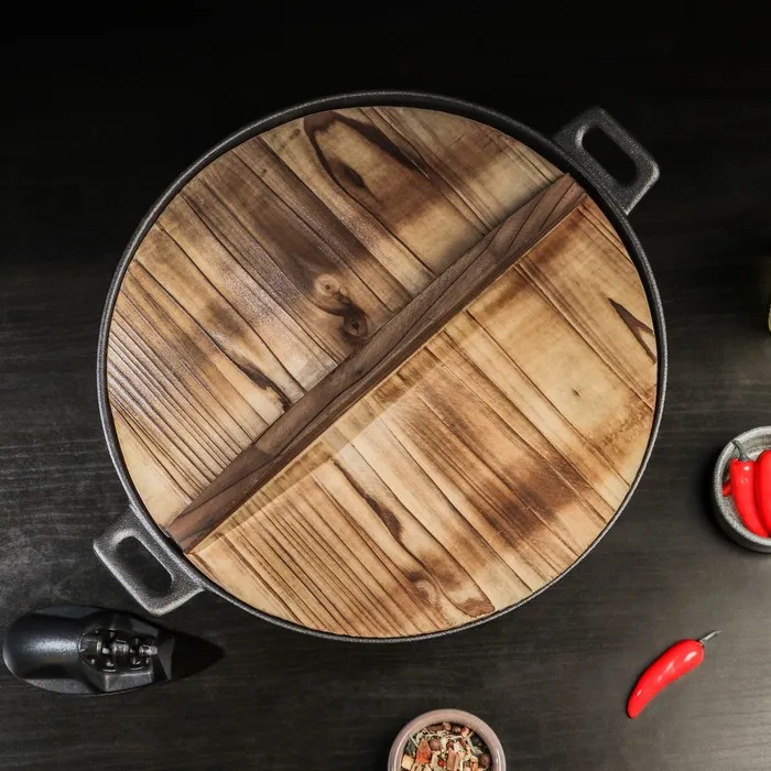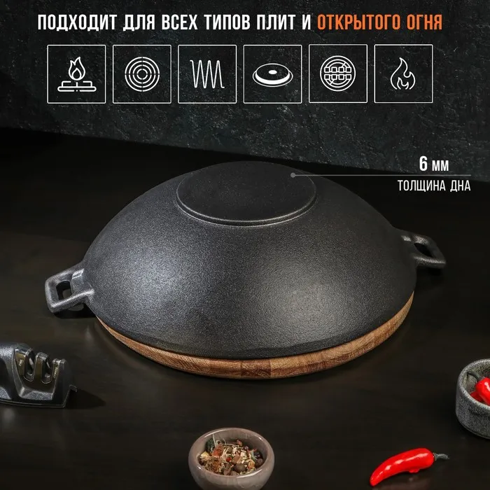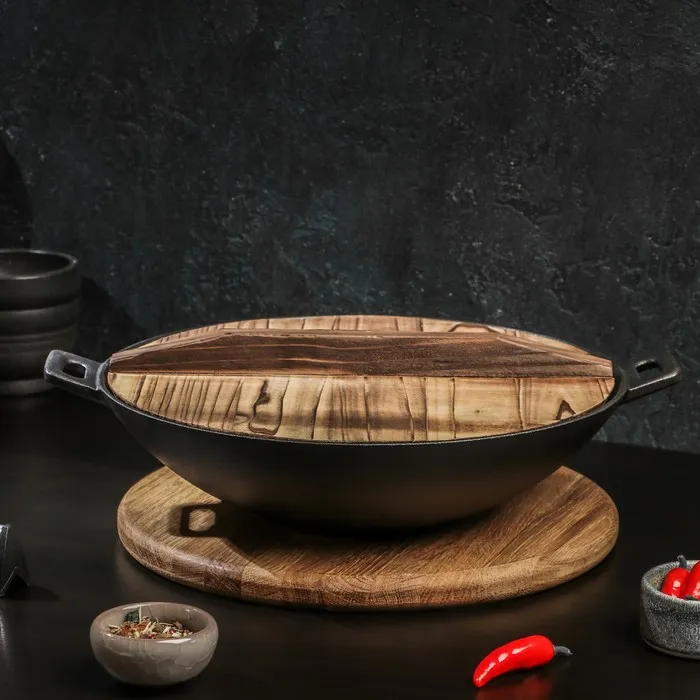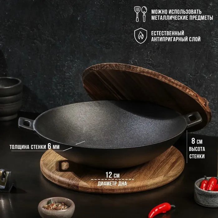 Сковорода-ВОК Magma «Хемминг», 31×8 см, чугун, с деревянной крышкой, индукция, чёрная — Характеристики