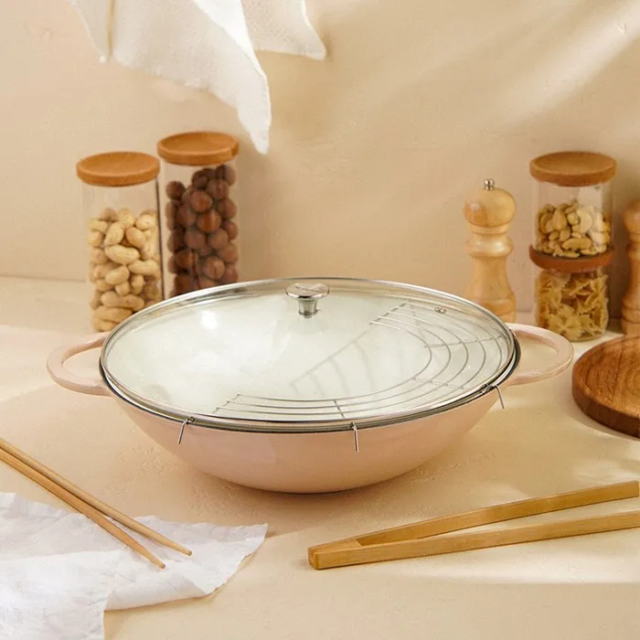 Погружайтесь в мир кулинарного искусства с изысканной чугунной сковородой-вок, выполненной в утончённом розовом цвете. Это не просто кухонный инструмент, а настоящее произведение искусства, сочетающее в себе стиль и функциональность.