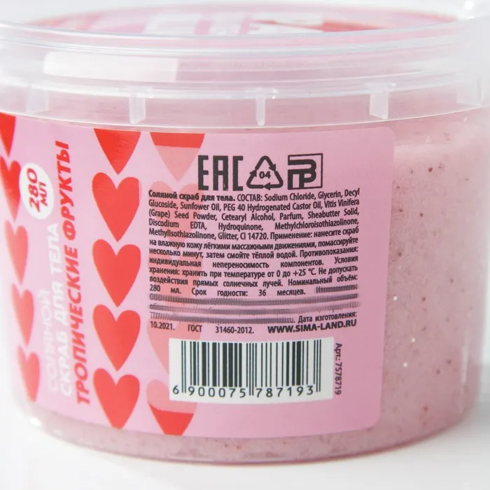 СОСТАВ: Sodium Chloride, Glycerin, Decyl Glucoside, Sunfower Oil, PEG 40 Hydrogenated Castor Oil, Vitis Vinifera (grape) seed powder, Cetearyl Alcohol, Parfum, Sheabutter solid, Discodium EDTA, Hydroquinone, Methylchloroisothiazolinone, Methylisothiazolinone, Glitter, CI 14720.