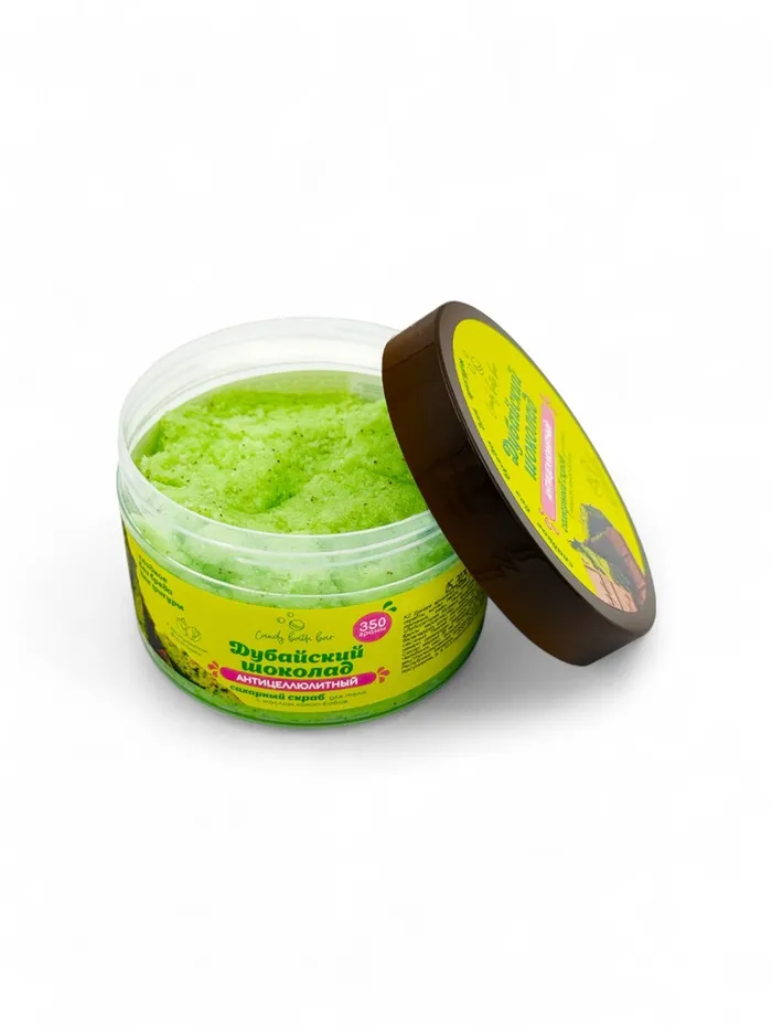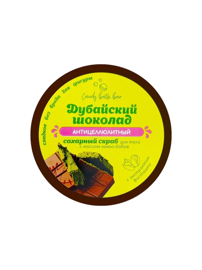Скраб Candy Baht Bar с солью и сахаром и ароматом дубайского шоколада — это идеальное сочетание интенсивного очищения и нежного ухода за кожей. Натуральные кристаллы соли мягко отшелушивают омертвевшие клетки, а сахар придаёт коже дополнительное смягчение и бархатистость. Питательные масла глубоко увлажняют и питают кожу, делая её гладкой и шелковистой.