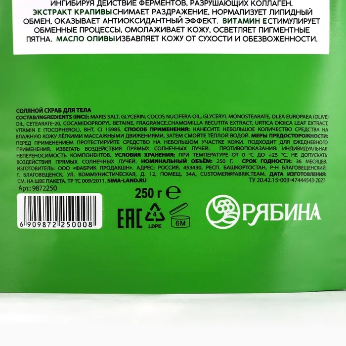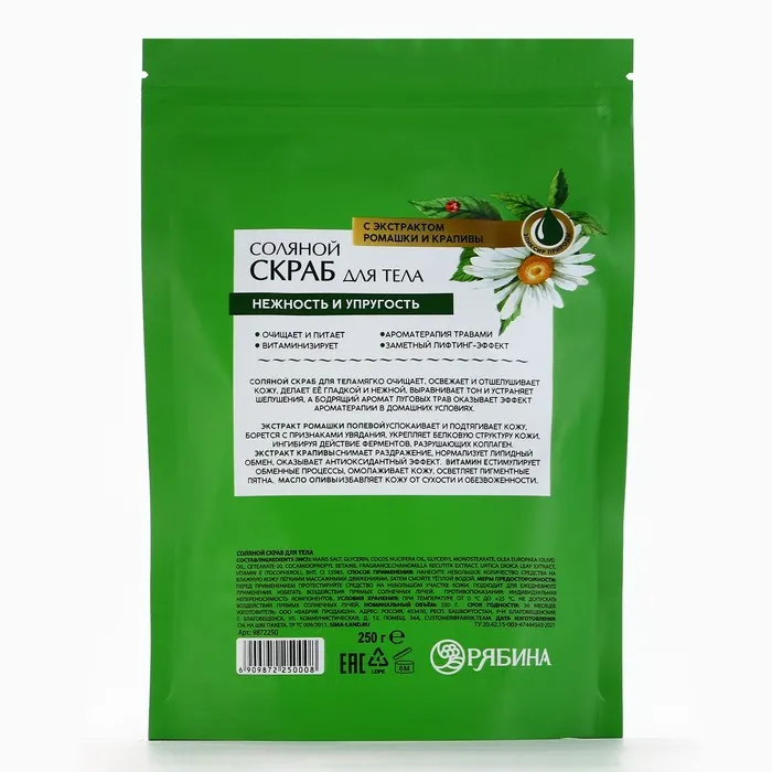 Скраб для тела соляной РЯБИНА, 250 г, с экстрактом ромашки и крапивы — Характеристики