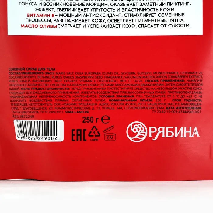 Скраб для тела, соляной с экстрактом малины, 250 г, РЯБИНА — Характеристики
