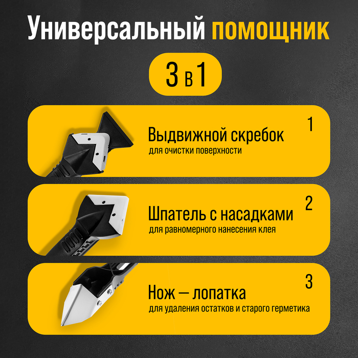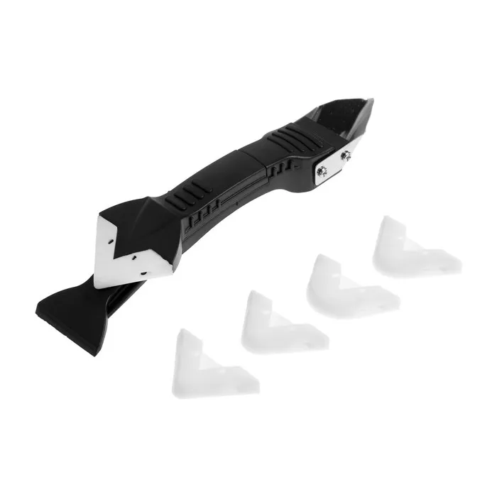 Один инструмент для разных задач. Многофункциональный скребок-шпатель 3 в 1 с комплектом из пяти насадок помогает удалять старый герметик, выравнивать свежие швы и аккуратно формировать стыки.