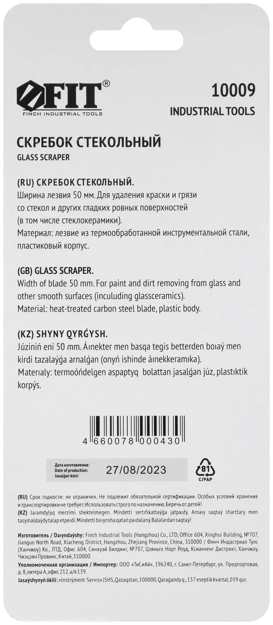 Конструкция скребка включает стальное лезвие и пластиковый корпус, что делает его лёгким и удобным в использовании. Длина инструмента составляет 200 мм, что позволяет комфортно держать его в руке и маневрировать.