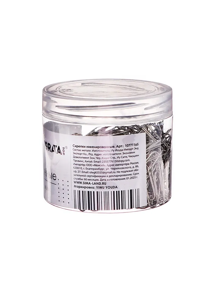 Эти никелированные скрепки в удобной пластиковой банке оживят ваш офисный стол. Прочные и надежные, они идеально подходят для организации документов любого размера. Благодаря серой металлической поверхности и классической круглой форме, эти скрепки станут вашим верным помощником в повседневных задачах. Банка содержит 400 штук — достаточно, чтобы быть уверенным в их наличии в любое время.