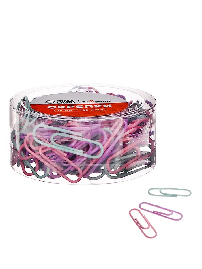 Скрепки 28 мм пастель в пластиковой тубе 100 штук