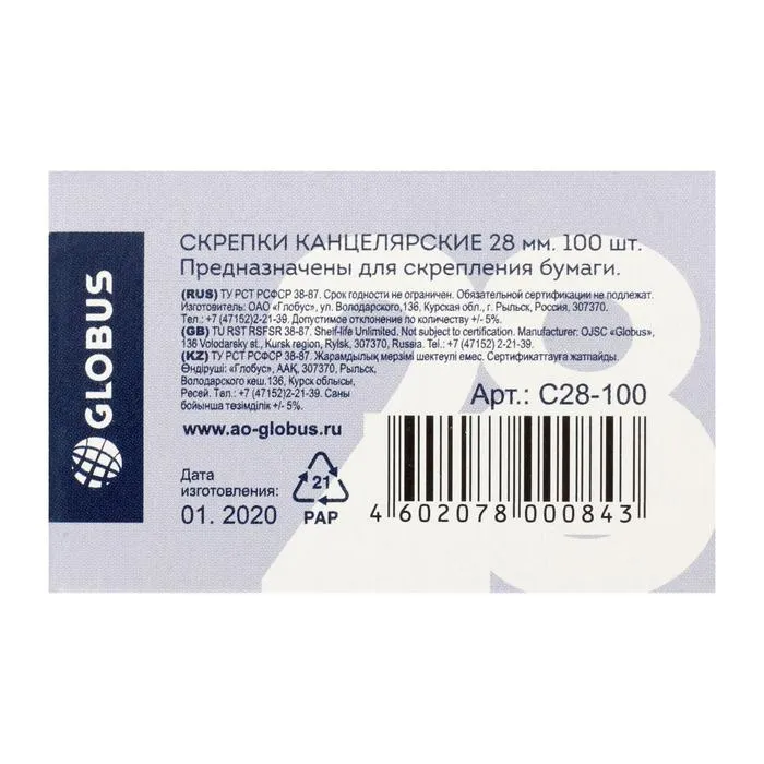 Скрепки канцелярские GLOBUS, 28 мм, 100 шт., без покрытия — Характеристики
