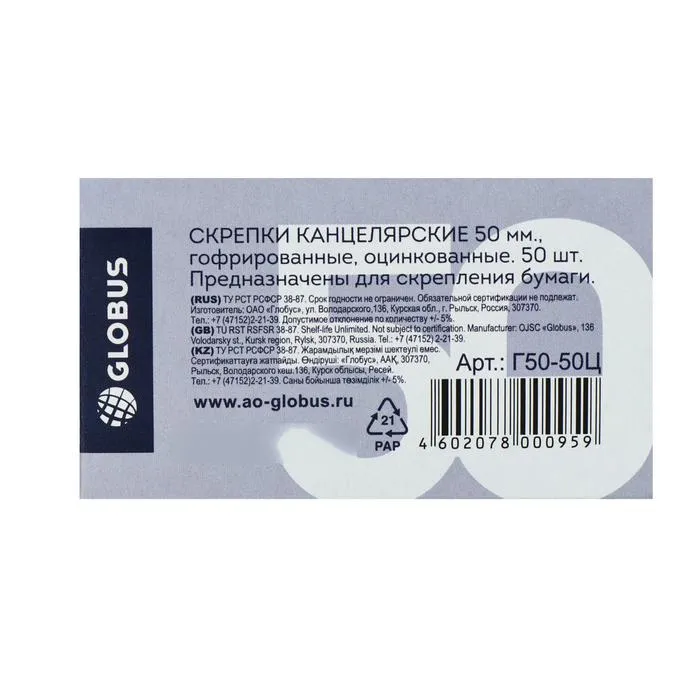 Скрепки канцелярские GLOBUS, 50 мм, 50 шт., оцинкованные, гофрированные — Характеристики