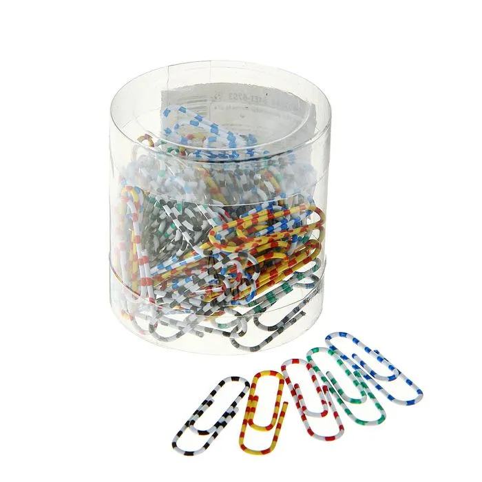 Скрепки изготовлены из стали, имеют классическую овальную форму и цветное пластиковое покрытие в полоску.Длина скрепки составляет 28 мм.Не окисляются и не повреждают документы.80 штук в пластиковой коробке.Приобрести скрепки можно в нашем интернет-магазине.