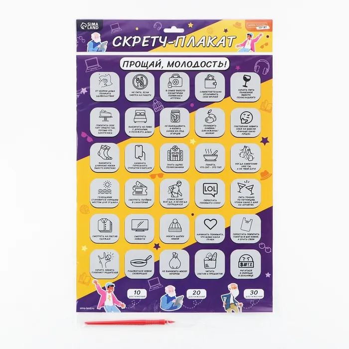 Этот плакат предлагает вам и вашим друзьям шанс проверить себя по забавному чек-листу из 30 пунктов, которые заставят вас задуматься и посмеяться над изменениями, которые происходят с возрастом.
