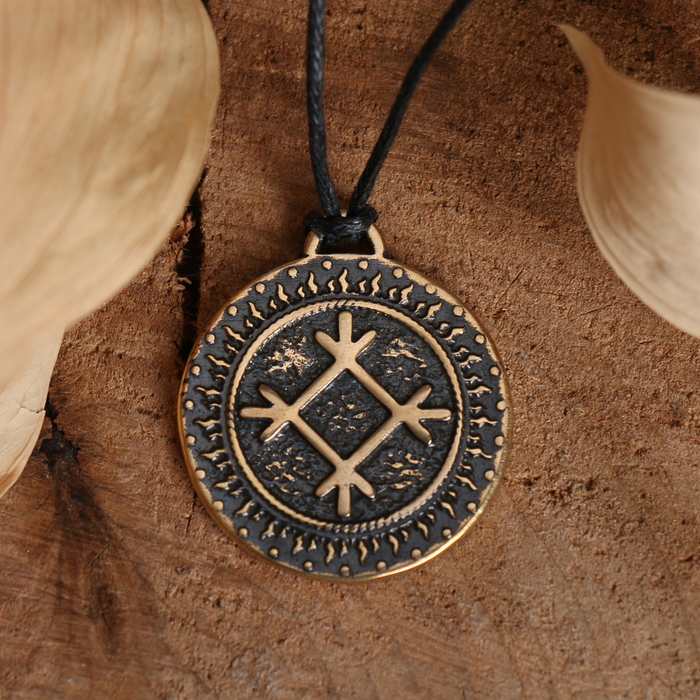 Изделие выполнено из прочной бронзы с благородным бронзовым оттенком и дополнено текстильным шнурком с чёрной фурнитурой, что обеспечивает комфортное и надёжное ношение. Универсальный дизайн подходит как для женщин, так и для мужчин, подчёркивая индивидуальность и духовную связь с древними символами.