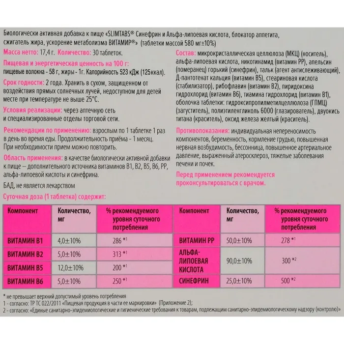«SLIMTABS Синефрин и Альфа-липоевая кислота, блокатор аппетита, сжигатель жира, ускорение метаболизма ВИТАМИР» содержит в своем составе витамины В1, В2, В5, В6, РР, альфа-липоевую кислоту и синефрин.