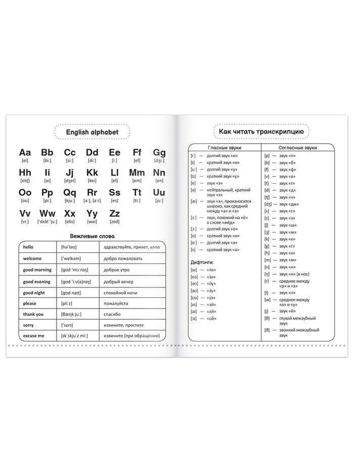 - Справочные материалы внутри: английский алфавит, правила чтения транскрипции и полезные вежливые фразы.