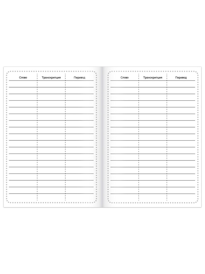 - 52 страницы с классическим делением на три столбца: слово, транскрипция и перевод, что упрощает изучение правильного написания и произношения.