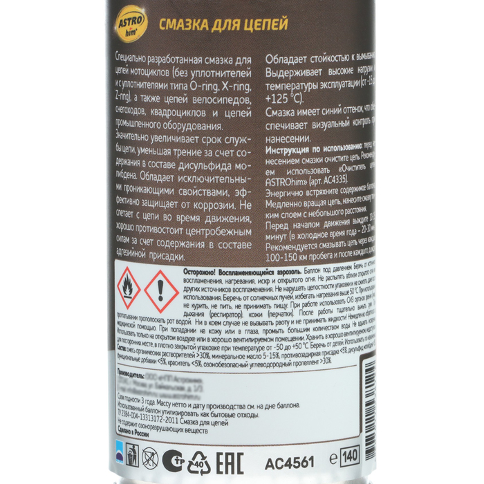 После нанесения на цепи остается хорошо держащаяся, смазывающая пленка, стойкая к воздействию воды и растворов солей, независимо от нагрузок и скоростей эксплуатации.