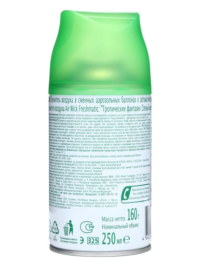 Наслаждайтесь изысканным ароматом спелого манго в течение 70 дней вместе с аэрозольным освежителем Air Wick Freshmatic Тропические фантазии Спелый манго.* Сменный баллон освежителя воздуха поможет поддерживать в доме приятный и свежий аромат. Средство прекрасно борется с любыми нежелательными запахами. Его можно устанавливать на кухне, в ванной комнате или туалете. Аэрозоль не оставляет разводов и других следов на занавесках, мебели и других предметах.