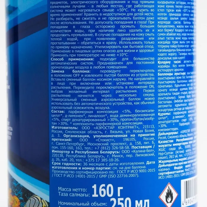 Состав: Парфюмерная композиция <5%, бензилсалицилат*, д-лимонен*, линалоол*, вода деминерализованная <5%, спирт денатурированный >30%, пропан/бутан/изобутан >30%. *- компоненты парфюмерной композиции.