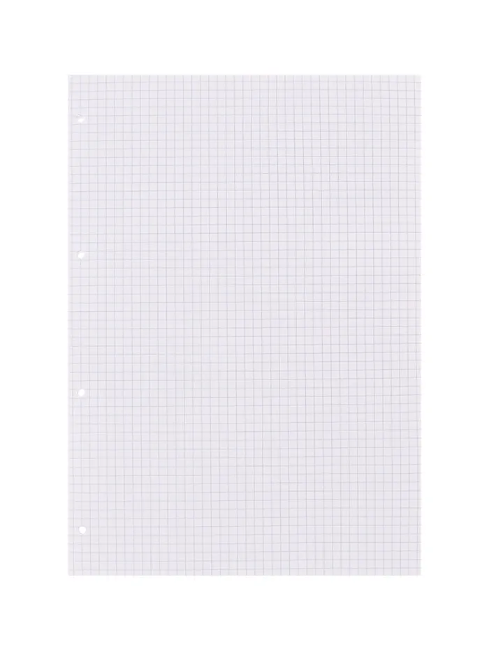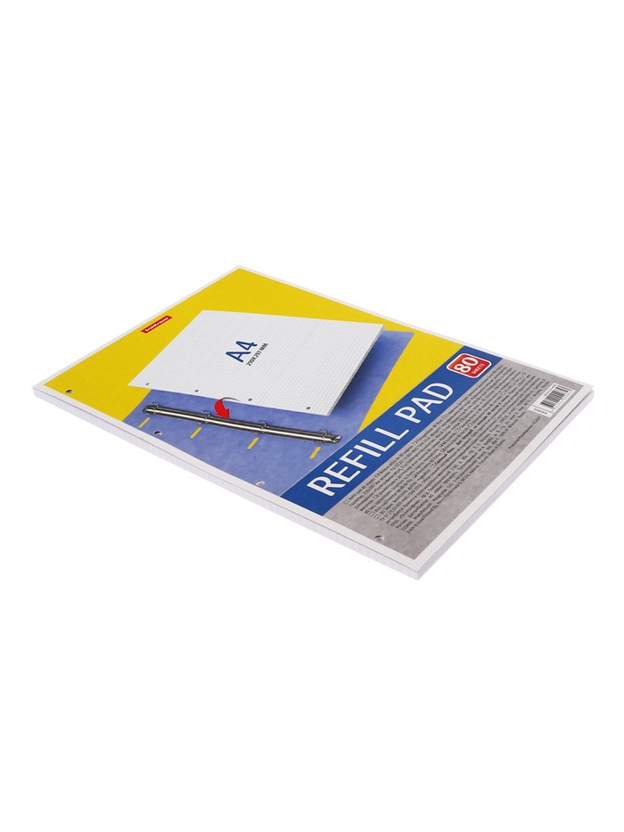 Сменный блок для тетрадей на кольцах формата А4 (210х297 мм). Благодаря плотной верхней обложке блок не деформируется. 80 листов в клетку. Бумага офсетная плотностью 60 г/м2. Цвет линовки - синий. Перфорация под кольца. Имеет индивидуальную упаковку в термоусадочную пленку