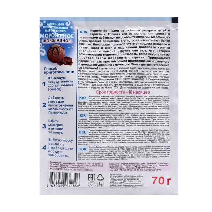 Смесь для приготовления мороженого «Приправыч», шоколадное, весом 70 г — это отличный способ порадовать себя и близких домашним десертом с насыщенным шоколадным вкусом. Легко и быстро приготовьте ароматное и прохладное мороженое, следуя простым шагам на упаковке.