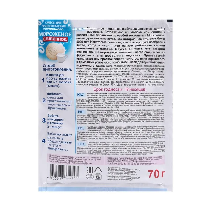 Состав: сахар, жировой порошок, глюкозный сироп, молочный белок, эмульгатор (Е472b), загуститель (натрия карбоксиметилцеллюлоза), стабилизатор (гуаровая камедь), ароматизатор «Сливки», соль.