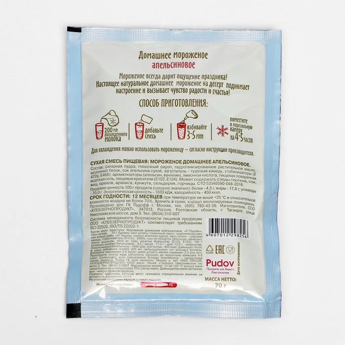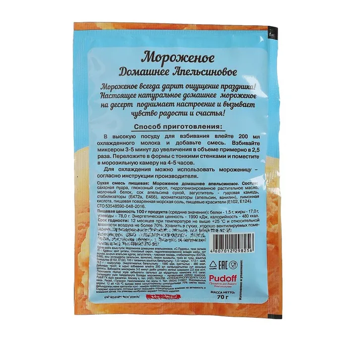 Состав: сахарная пудра, глюкозный сироп, гидрогенизированное растительное масло, молочный белок, сок апельсина сухой, загуститель-гуаровая камедь, стабилизаторы (Е472а, Е466), ароматизаторы (апельсин, ванилин), лимонная кислота, пищевая поваренная морская соль, пищевые красители(Е102, Е124). Может содержать следы глютена, сои, яиц, орехов, арахиса, кунжута, сельдерея, горчицы.