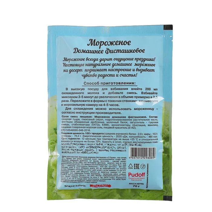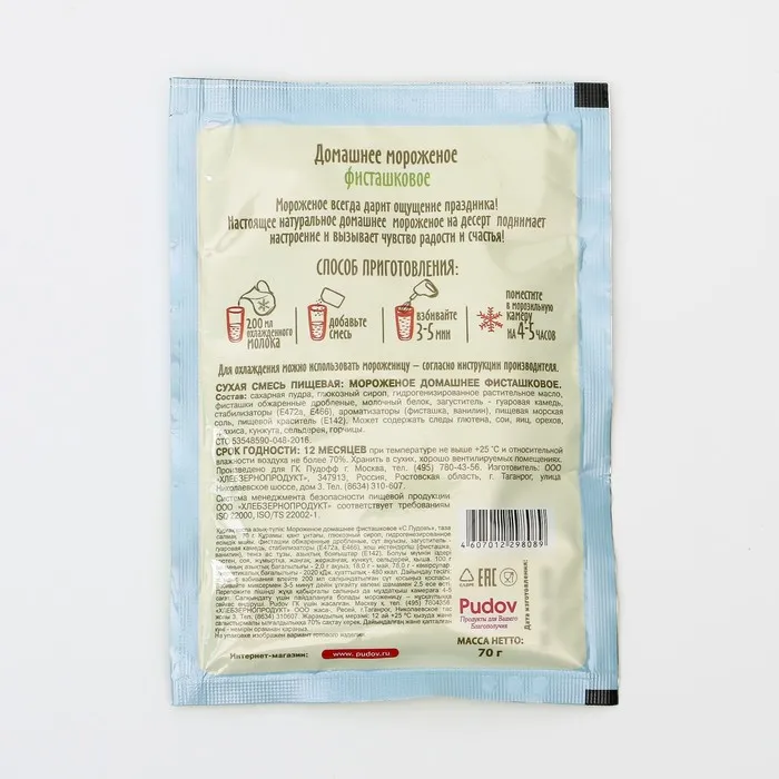 Состав: сахарная пудра, глюкозный сироп, гидрогенизированное растительное масло, фисташки обжаренные дробленные, молочный белок, загуститель - гуаровая камедь, стабилизаторы (Е472а, Е466), ароматизаторы (фисташка, ванилин), пищевая морская соль, пищевой краситель (Е142). Может содержать следы глютена, сои, яиц, орехов, арахиса, кунжута, сельдерея, горчицы.